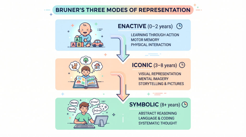 Bruner emphasized that these stages are not strictly age-bound and can overlap. His theory highlights “learning by doing” and the importance of active participation in the learning process.